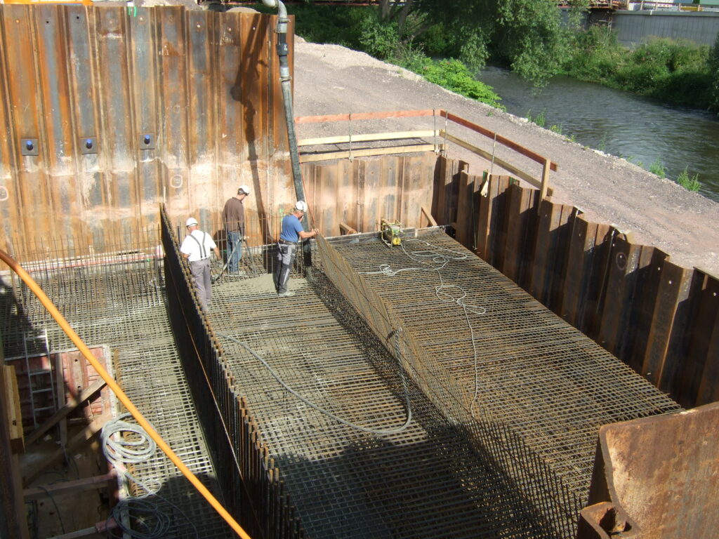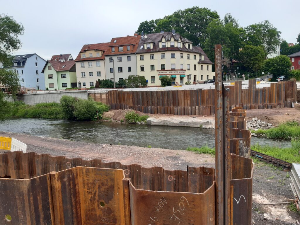 Aktuell erfolgt die Herstellung der Widerlager des Ersatzneubaus der Friedrich-Naumann-Brücke. Die Spundwandkästen des Widerlager Nord und Widerlager Süd wurden errichtet. Momentan erfolgen Bewehrungs- und Betonagearbeiten.
