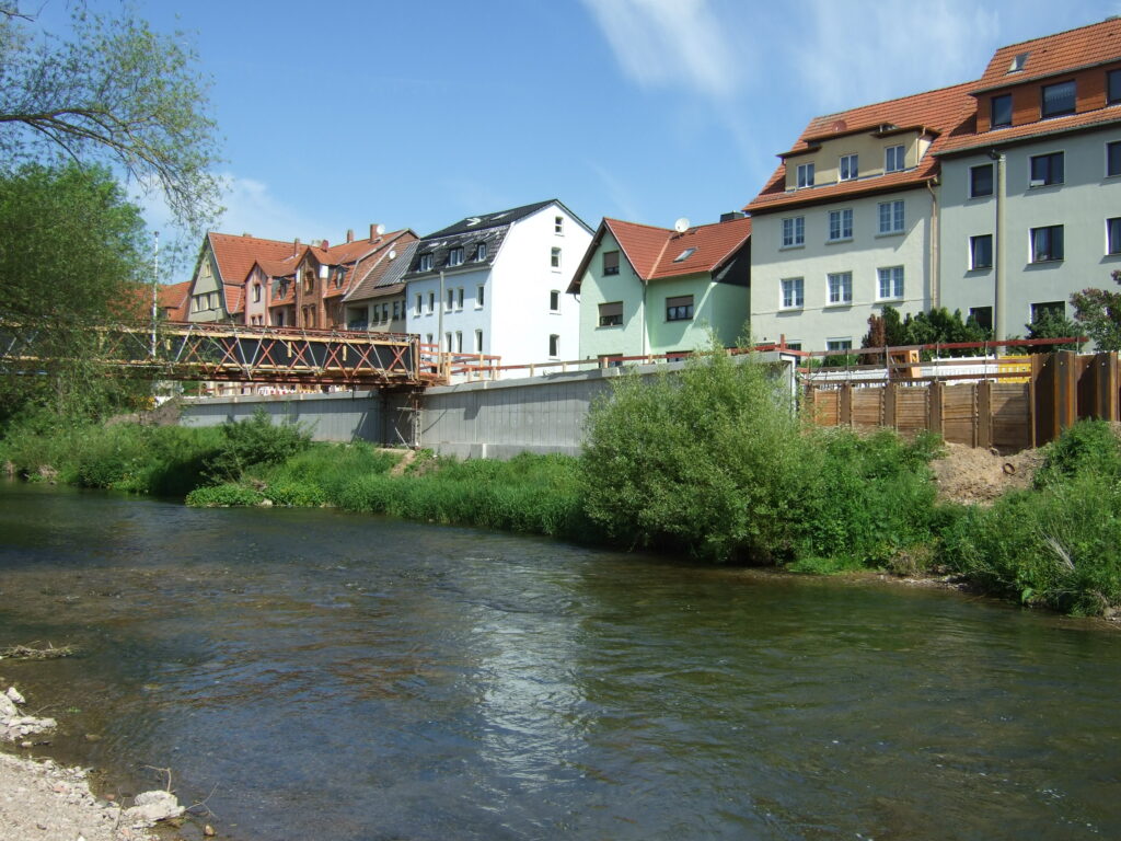 Die ehemals vorhandene Fußgängerbrücke / Behelfsbrücke konnte während der Bauarbeiten aufgrund der Nähe zur bestehenden Brücke leider nicht als Querung der Hörsel erhalten bleiben. Daher erfolgte im Frühjahr 2021 die Errichtung einer Behelfsbrücke für Fußgänger und Radfahrer gut 30 Meter von der ehemals bestehenden Brücke entfernt
