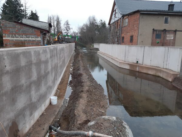Hochwasserschutzwand beidseitig des Mühlgrabens (Blick stromab), Fotoaufnahme TLUBN 12/2021