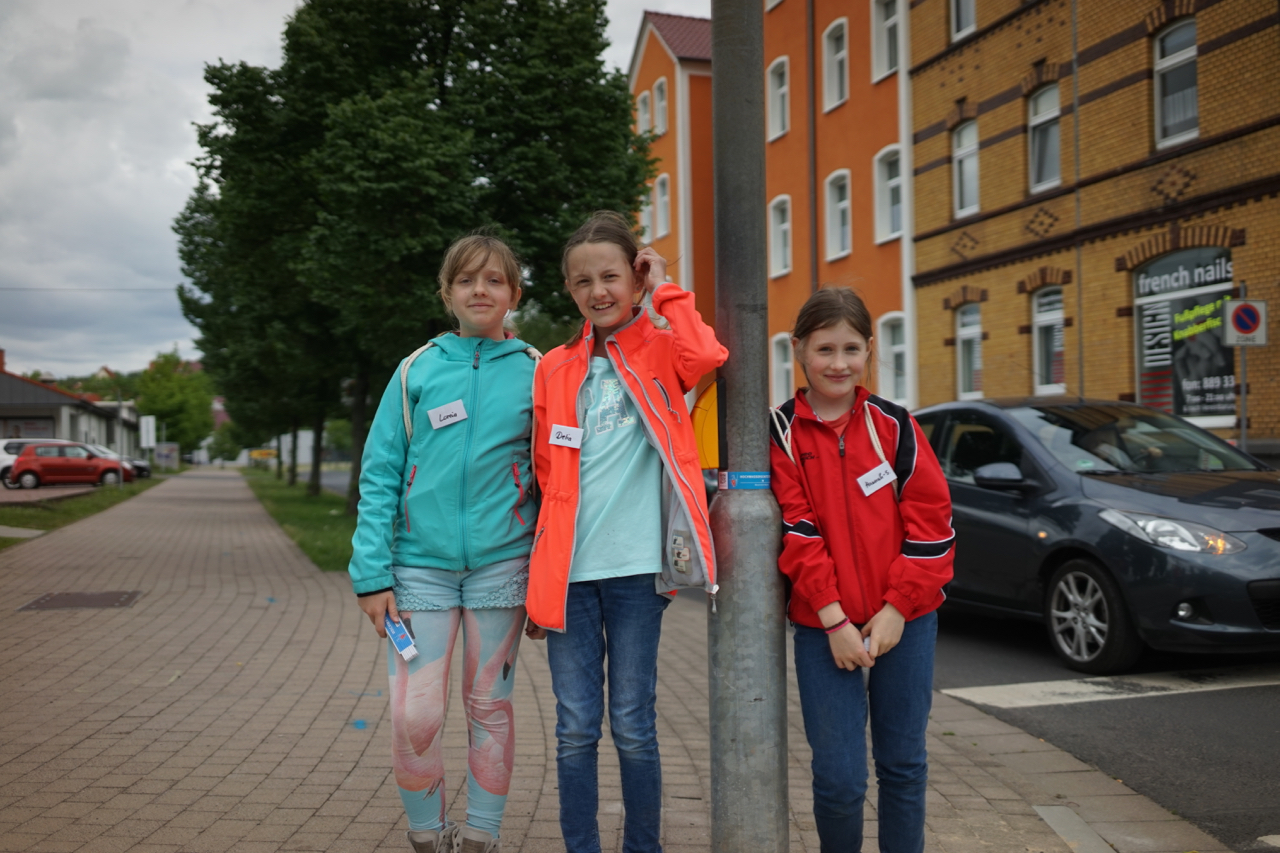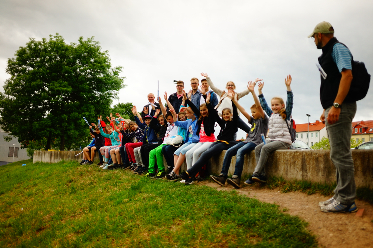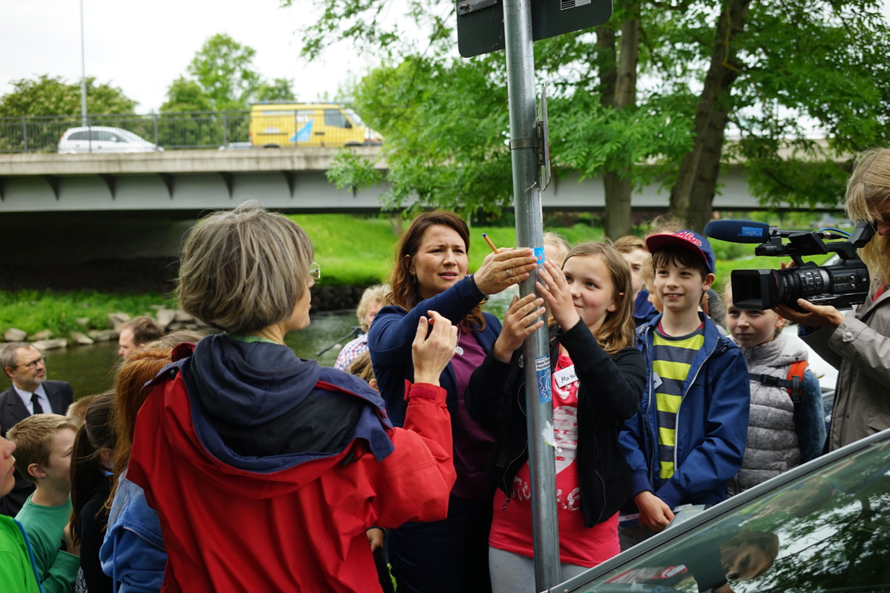 Abschließend haben die Schüler der fünften Klassen, angeleitet durch die Seminarfachgruppe der 11. Klasse und gemeinsam mit Vertretern der Thüringer Landesanstalt für Umwelt und Geologie, weitere Hochwassermarken in Eisenach angebracht.
