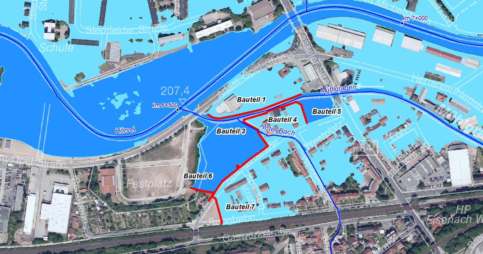 Zur Vermeidung der vorgenannten Ausuferungen durch Rückstau aus der Hörsel werden entlang des Mühlgrabens und des Roten Baches Hochwasserschutzwände errichtet. Die Spielplatzfläche westlich der Kasseler Straße verbleibt im Überschwemmungsgebiet.